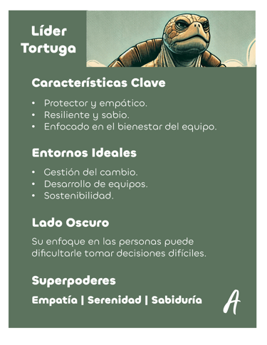 En el liderazgo, la tortuga simboliza la importancia de la empatía y la construcción de relaciones basadas en confianza. Este perfil prioriza el bienestar del equipo, comprendiendo que el éxito sostenible se logra a través de pequeños pasos consistentes y un enfoque colaborativo. Un líder Tortuga sabe cómo crear un entorno de armonía y seguridad emocional donde cada individuo pueda desarrollarse al máximo. La fuerza de este líder radica en su capacidad para conectar con las personas, escuchar sus necesidades y guiar con paciencia hacia un objetivo común, asegurándose de que el camino sea tan valioso como el destino.