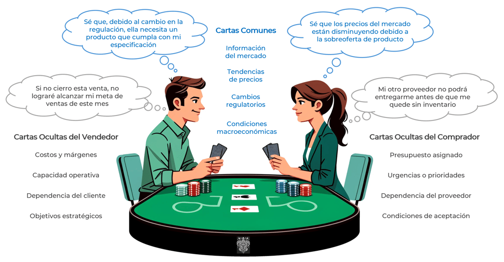 Una negociación no es un enfrentamiento entre rivales, sino un juego estratégico en el que ambos jugadores buscan construir el mejor escenario posible. Tanto el comprador como el vendedor tienen un rol activo en la creación de valor, y sus habilidades para interpretar las cartas comunes y manejar sus cartas privadas determinarán el resultado final.